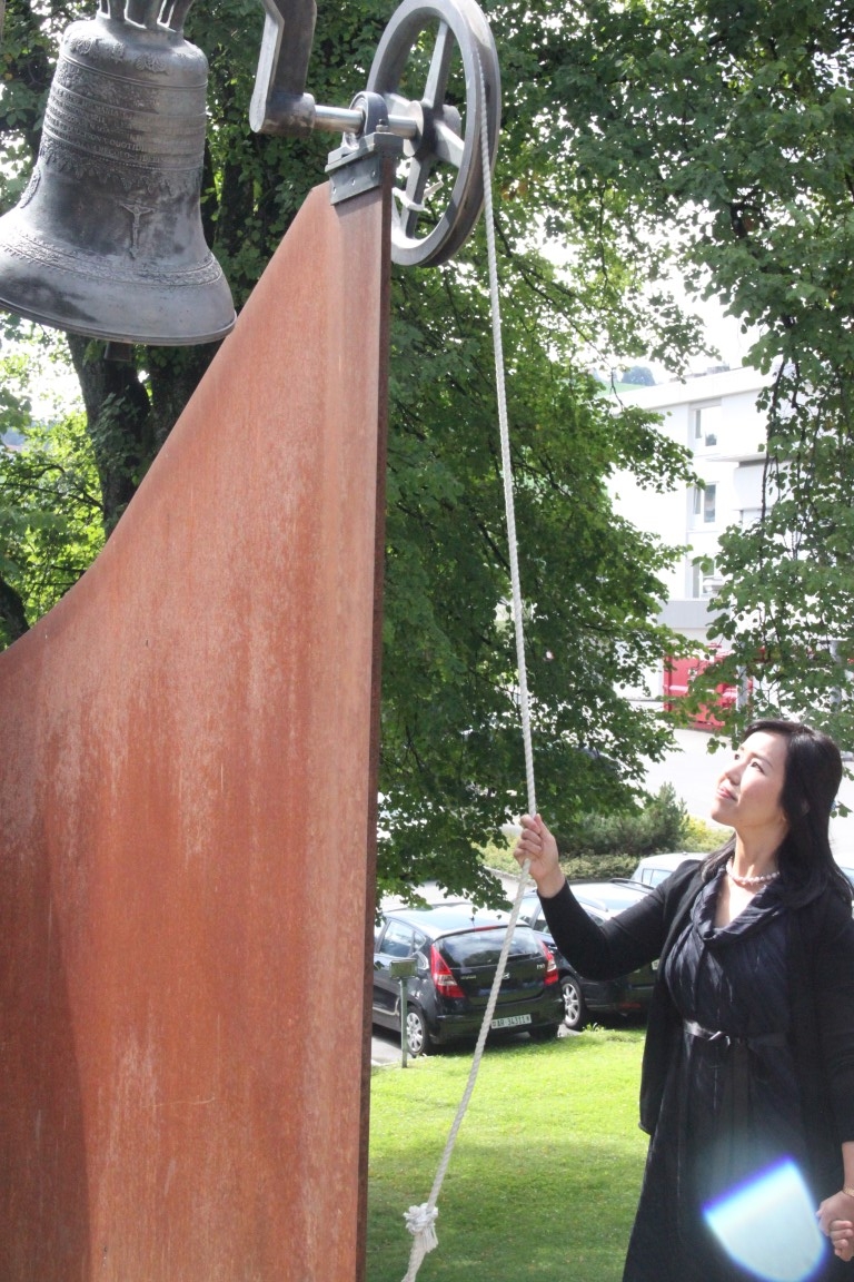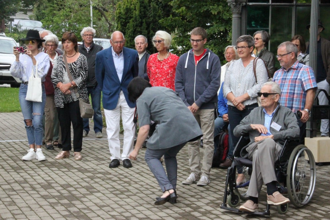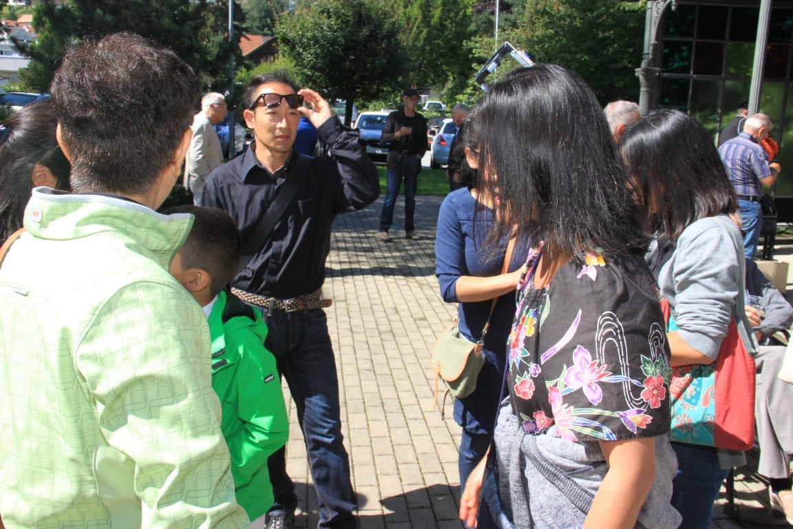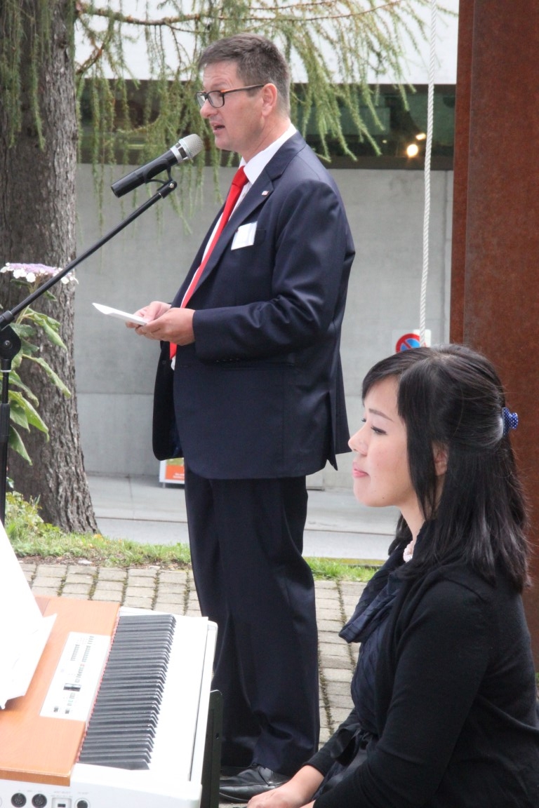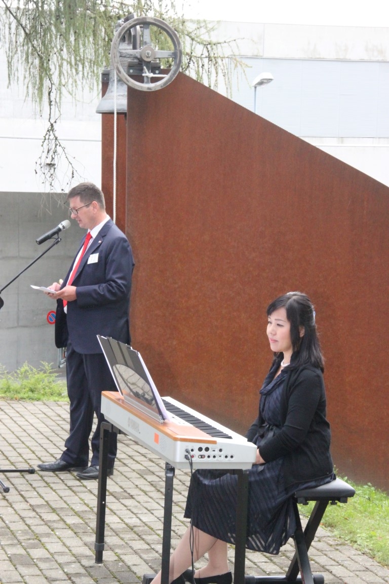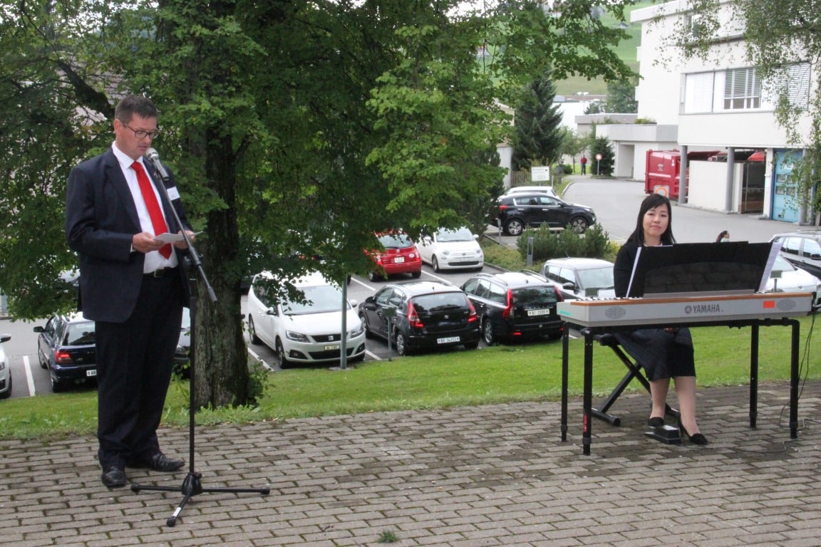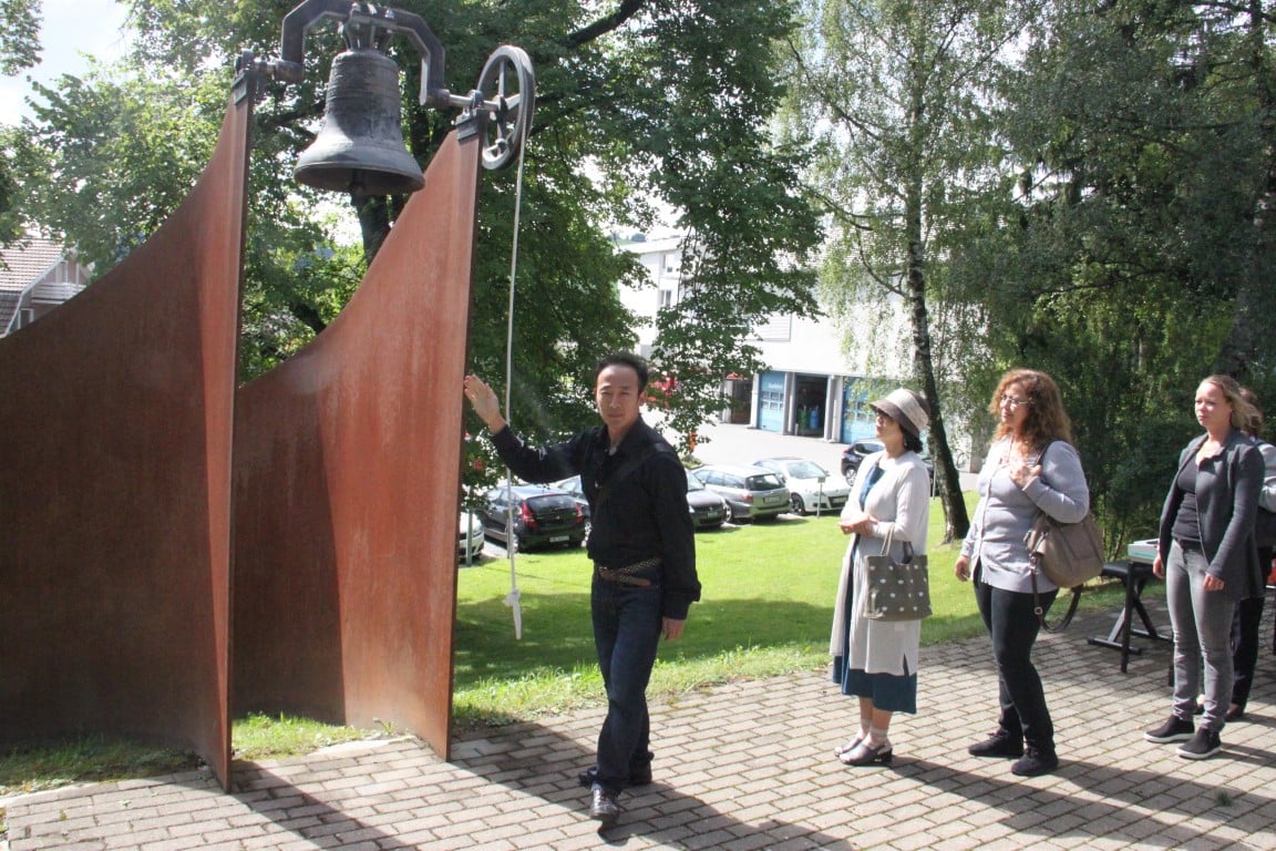 Rund 80 Personen wohnen dem 72. Gedenktag anlässlich des Atombombenangriffs der USA auf Nagasaki in Heiden bei und läuten die «Peace Bell» beim Henry Dunant- Museum. Auch sieben Yamatos sind an diesem würdevollen Anlass, der wunderschön von der Sopranistin Hiroko Haag mit japanischen Liedern umrahmt wird, mit dabei: Atsuko, Alex Angehrn, Temucin, Hayami, Jandira, Georg und Christof. Nach dem Apéro begeben wir uns zu Fuss ins Hotel «Linde», wo wir gemeinsam ein Mittagessen einnehmen und uns über die verschiedensten japanischen Themen angeregt unterhalten.