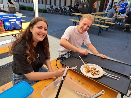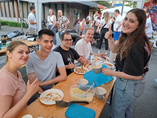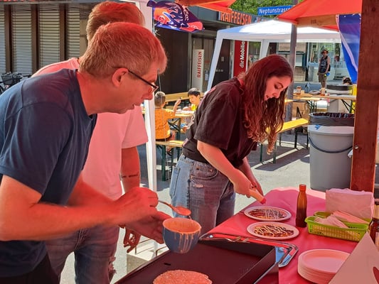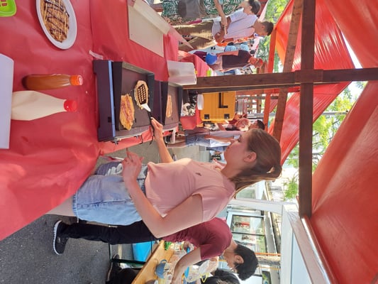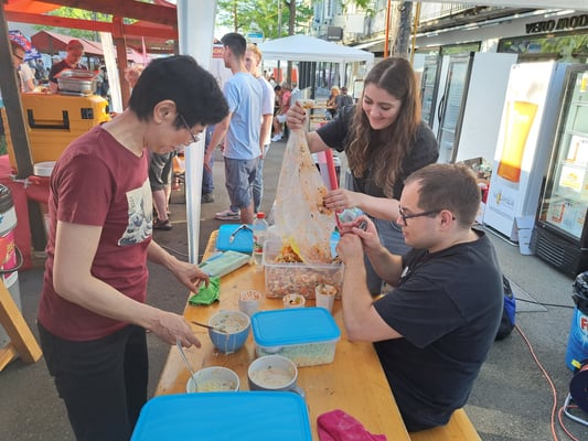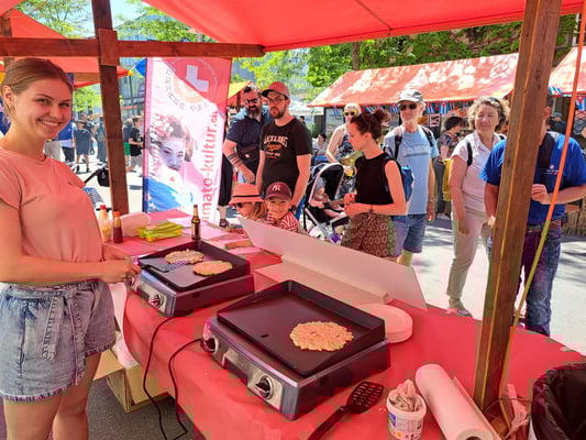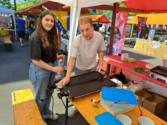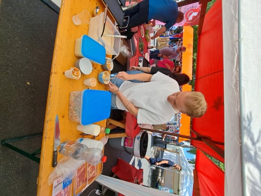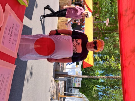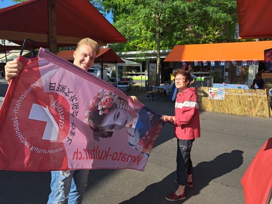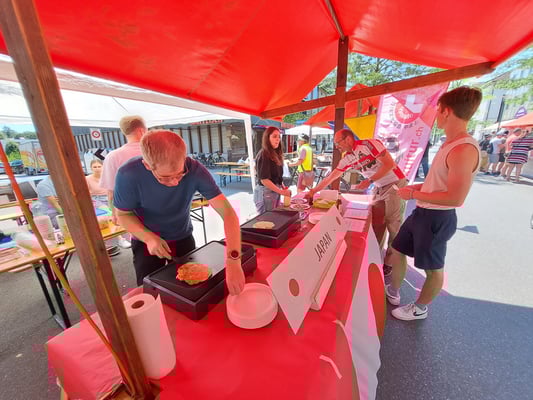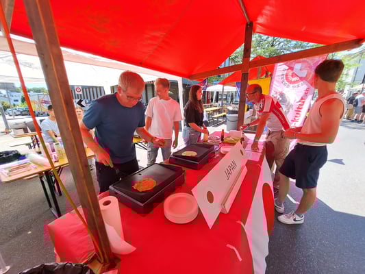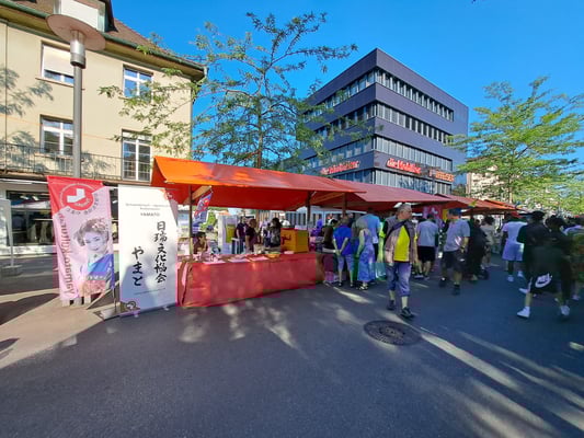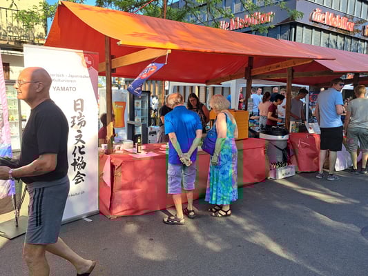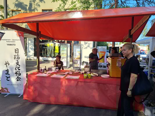 Beim wunderschönen Wetter war das Chrüzlinger Fäscht inklusive  unseren Japan-Stand wieder ein grosser Erfolg. Okonomiyaki und Yakitori sowie Kirin-Ihiban verkauften sich sehr gut. Einige Kunden kamen nach dem Kauf sogar extra zu uns zurück, um uns mitzuteilen, wie gut das Essen geschmeckt hat. Es hat uns besonders gefreut, dass ein Berufsmetzgar gleich auf der Stelle zwei relativ grosse Spiesse Yakitori gegessen und sie gelobt hat. Das Fleisch, die Sosse und die Grill-Methode seien richtig gut und professionell. Ja, wir verwenden sehr gutes Fleisch (Man hätte es noch teurer verkaufen sollen/können). Zudem gibt es tatsächlich einen Profikoch und Grillmeister unter den Yamato-Mitgliedern. Er ist ein grosser Schatz für uns alle. Der Auftritt «unserer» japanischen Trommelgruppe «Genkidaiko» kam ebenfalls sehr gut an.